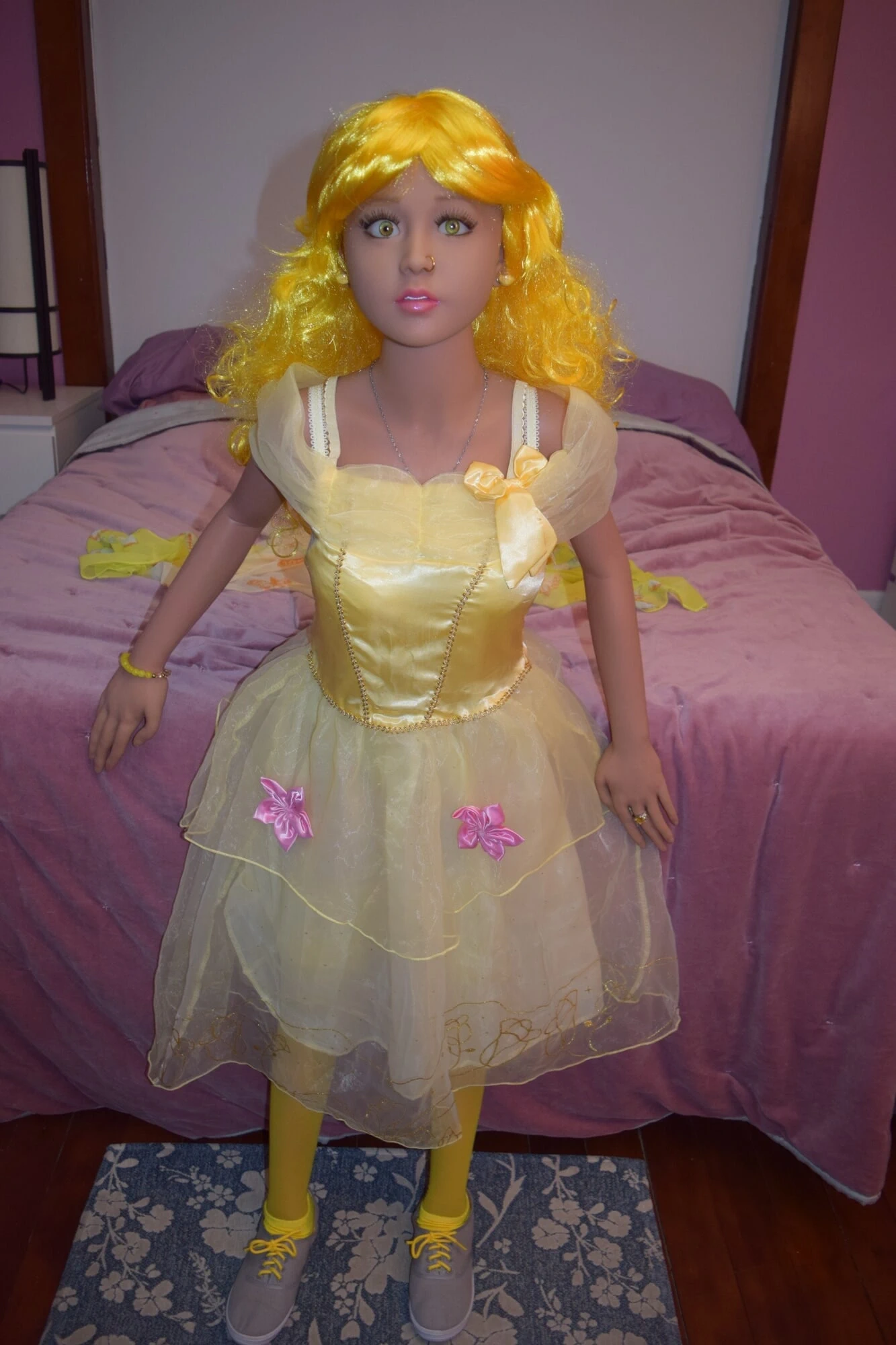 She weighs 54# and is 140cm tall. She is made of TPE, with a metal skeleton. After a corn starch massage she feels amazing and I can barely keep my hands off her to snap some shots. Especially after I get her all dressed up!